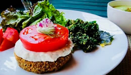 Photo 2 : Un hamburger vegetalien cru, compose principalement de noix, illustrant le potentiel dfune cuisine alternative sans noix.
